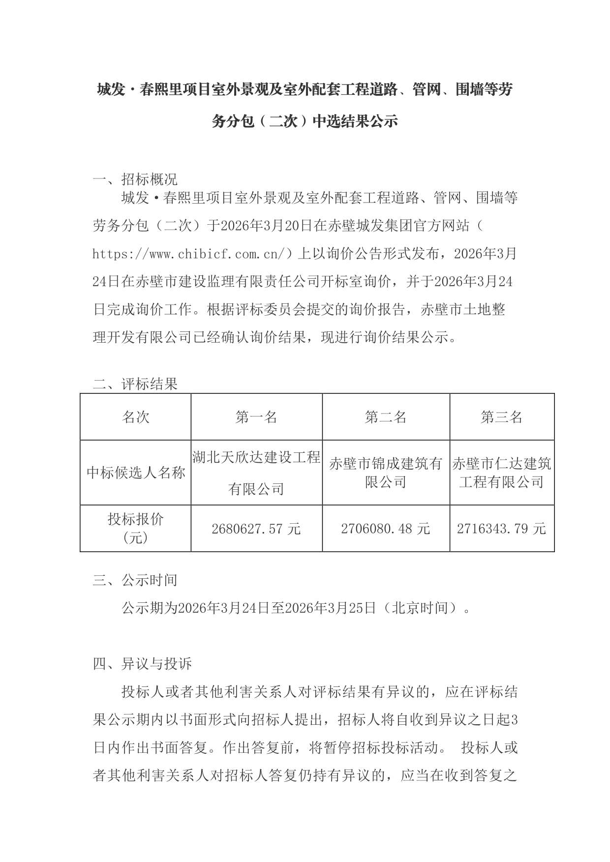 城发·春熙里项目室外景观及室外配套工程道路、管网、围墙等劳务分包(二次)成交公示