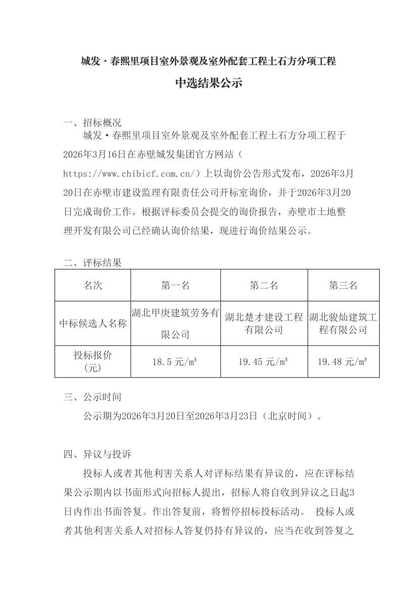 城发·春熙里项目室外景观及室外配套工程土石方分项工程中选结果公示