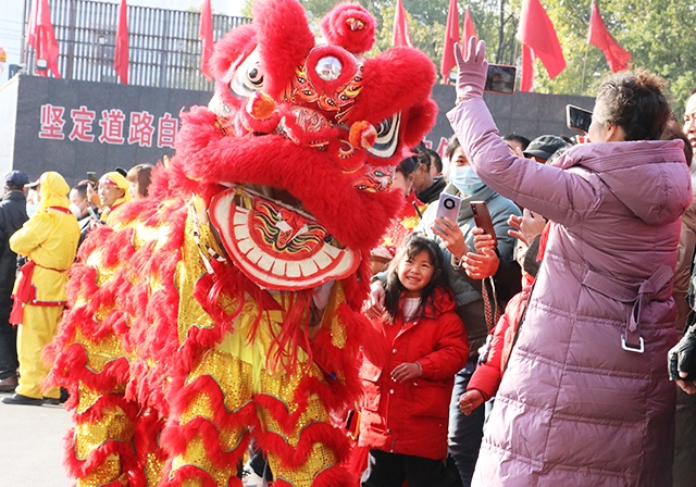 广场上“咚咚咚”的震天锣鼓声响起,伴随着鼓点的快慢轻重,9条长龙时而翻滚穿梭,时而盘旋腾跃;6头威武雄壮的狮子时而卧爬、时而奋跃,好一场集武术杂技为一体的醒狮表演。市民们纷纷摸龙须狮头,或拍照留念,兔年新春图一个好兆头。